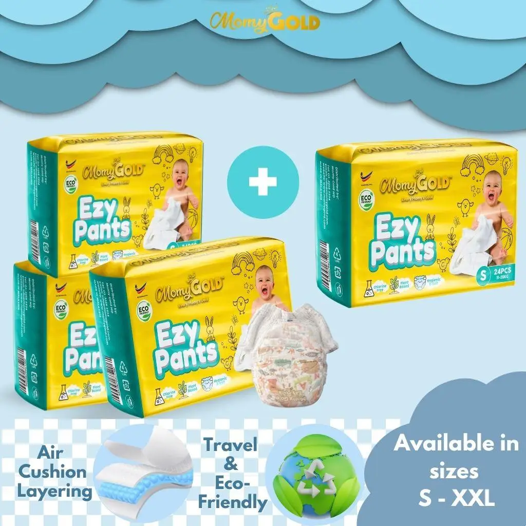Nikmati penjimatan maksimum dengan Promosi Buy 3 FREE 1 Momy Gold Ezy Pants. Direka dengan material yang lebih lembut, ringan, dan selesa, sesuai untuk bayi aktif serta kegunaan travel. Dilengkapi ciri eco-friendly dan kadar serapan tinggi sehingga 650ml untuk keselesaan sepanjang hari.